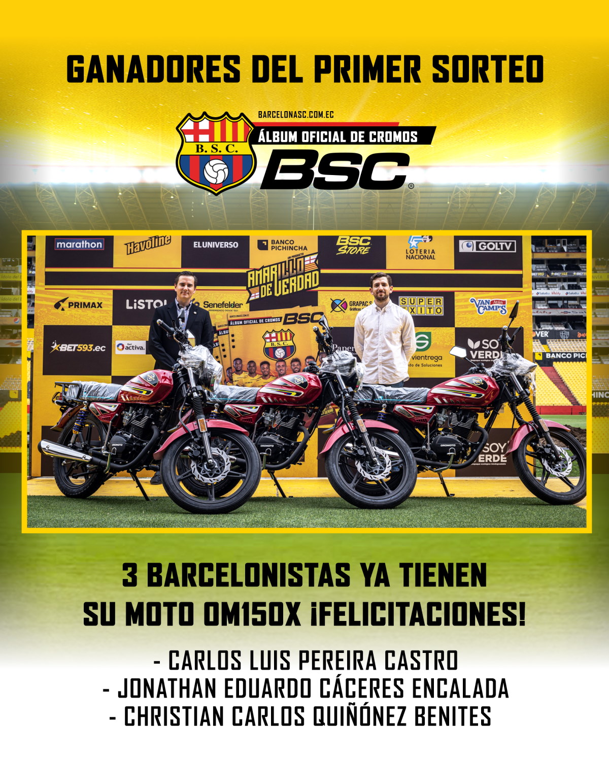 El pasado 12 de julio, en las instalaciones del Estadio Banco Pichincha, se realizó el primer sorteo del Álbum Oficial BSC, que premió con tres flamantes motos OM150X 2022, entre quienes registraron su álbum en nuestro link album.barcelonasc.com.ec.