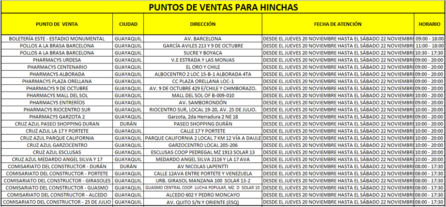 Ventanillas Estadio Banco Pichincha (Lado Oeste) – del 20 de noviembre al 22 de noviembre de 09h00 a 17h30.